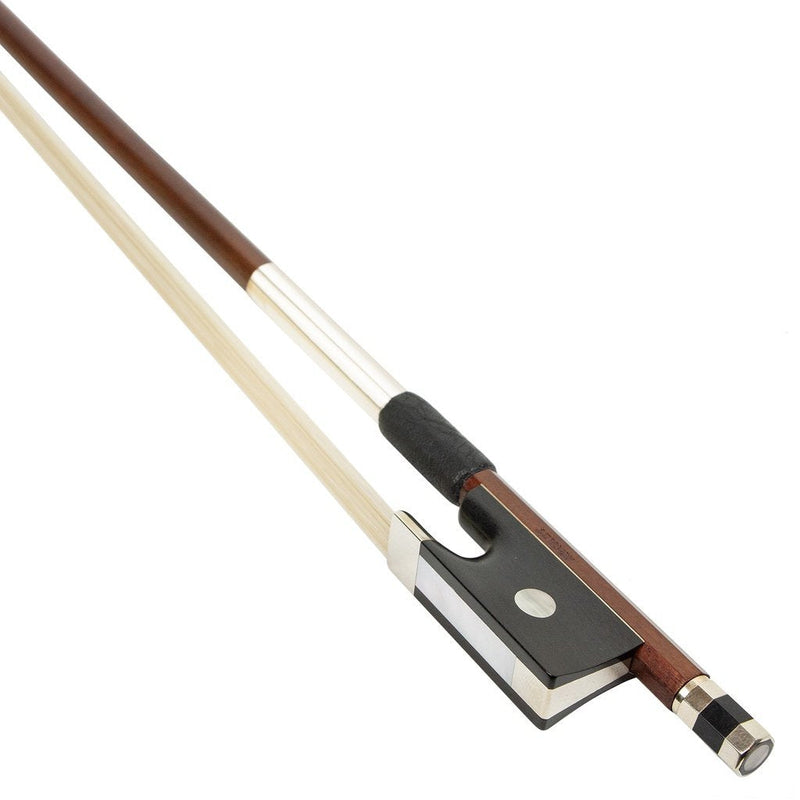 This violin bow is stamped ‘ARC.JP,’ and is one of the workshops 'standard' grade bows. This bow is made from pernambucco and the stick has been rounded. It has silver lapping & an ebony frog. It is nickel-silver mounted with a Parisian shell eye. This bow is based on an Ouchard model.