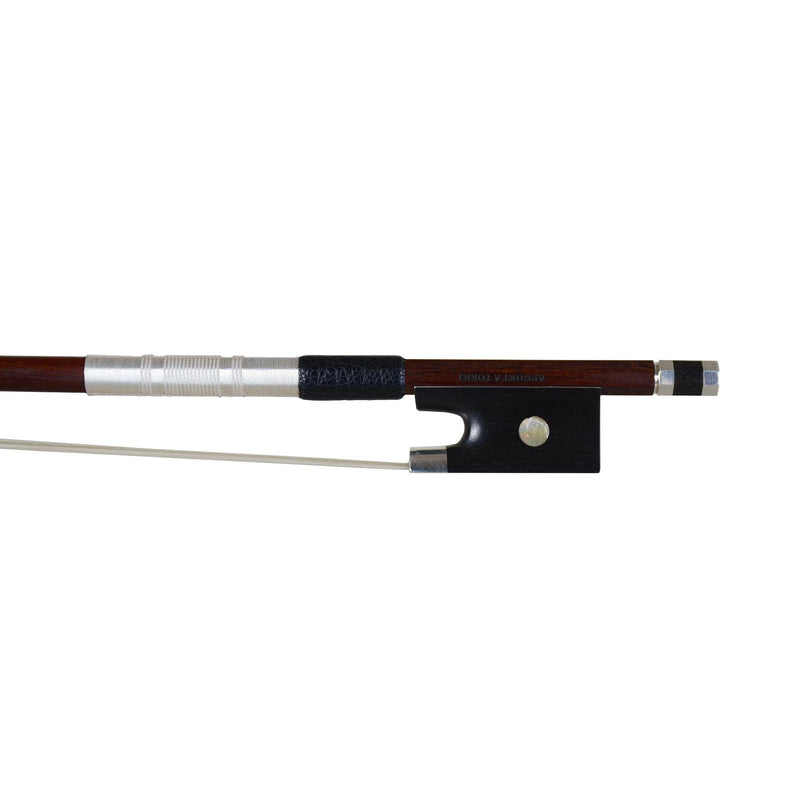 This violin bow is stamped ‘Archet A Tokio,’ and is one of the Archet workshops high-grade bows. This bow weighs 60.3 grams & is made from fine pernambucco. Archet pride themselves on having some of the finest quality pernambucco that is currently available anywhere in the world. The stick has been rounded & measures 743mm in length. It has silver lapping & an ebony frog. It is silver mounted with a shell eye. This bow is based on a Peccatte model.
