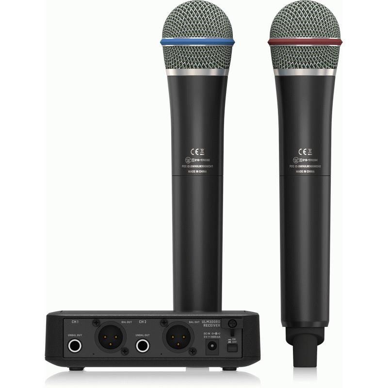 Once again we’ve broken the affordability barrier – with our new ULTRALINK ULM302MIC Wireless Microphone System, which includes 2 of our high-quality ULM300M handheld mics – and the equallyimpressive ULM300RD dual-channel receiver. Now you are free to work the room to your heart's content, without the hassle and restriction of cables underfoot. Highest-quality sound is provided by the ULM300MIC’s customdesigned microphone capsule that is optimized for vocal performance, and the built-in transmitter that operates in the license-free 2.4 GHz range.