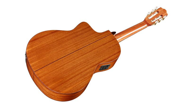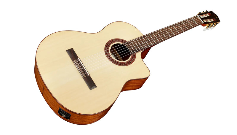 Based on Córdoba's top-selling C5-CE, the C5-CE Spruce adds a new option to a fan favorite. A soft cutaway provides easy access to the upper register, and a Fishman Presys II preamp amplifies your signal for stage and studio. Perfect as a first nylon-string guitar and ready for gigging, this lightweight model is built with a solid Engelmann Spruce top and Mahogany back and sides to produce a clear, powerful tone with beautiful sustain. Handmade in the traditional Spanish style, the C5's carved headstock, hand-inlaid wood rosette, Indian Rosewood binding, Savarez strings, and glossy PU finish result in a guitar that truly stands out from all other entry-level options. A lightweight adjustable truss rod is built into the neck for stability. Available in Natural finish with solid Engelmann Spruce top.