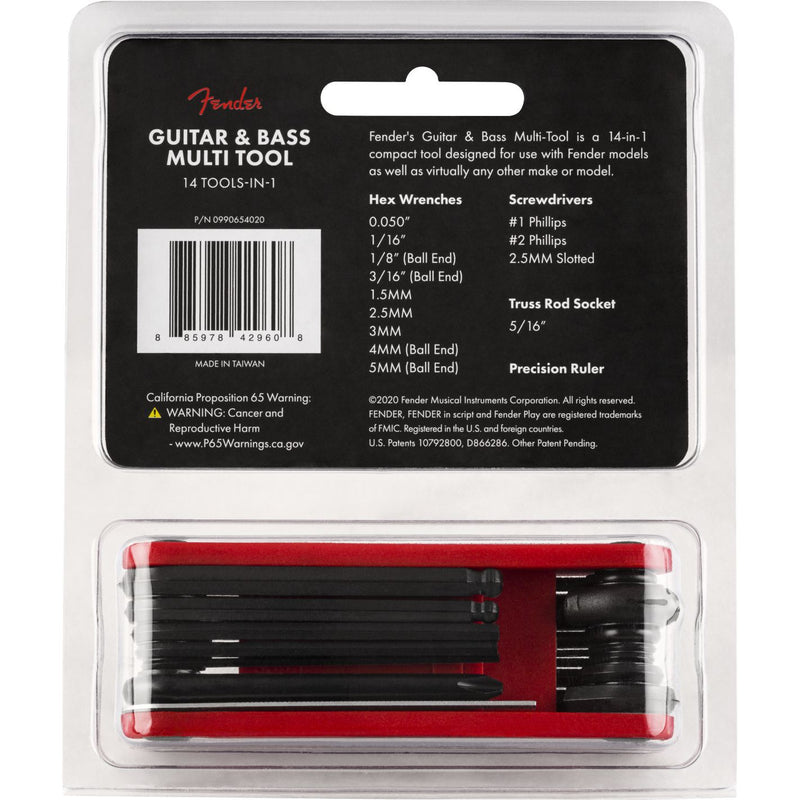 Fender's Guitar & Bass Multi-Tool is a 14-in-1 compact tool designed for use with Fender models as well as virtually any other make or model. Its one-piece body allows for ease of use and rotation while the included truss rod size hex wrenches are ball end for easy access. Featuring standard and metric sizing, this multi-tool serves as a toolbox in your pocket, providing maximum functionality for all of your instrument repair and tech work needs.