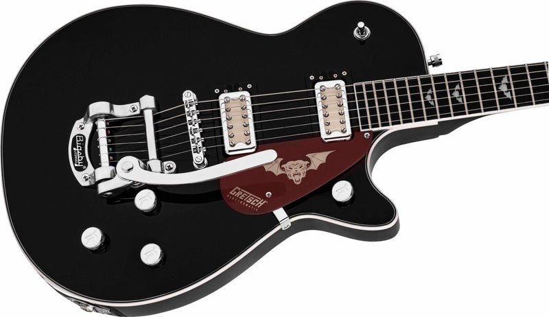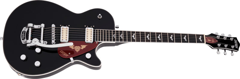 For nearly 70 years, the Gretsch Jet has been the hallmark sound for iconic players. Nick 13 puts his own stylistic spin on the classic instrument with dark and moody design elements including a sleek Black finish, white binding, oxblood pickguard with TigerBat logo and matching truss rod cover with his signature, cream pickup inserts, chrome hardware and distinctive pearloid TigerBat inlays.