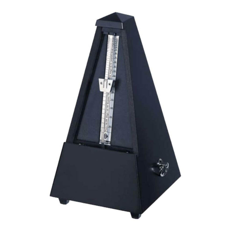 Wittner Maelzel Metronome - Woodgrain Plastic, Black 855161. Pyramid-style wood-grain plastic metronome with bell. Matching solid wood-grain plastic front cover. Made in Germany.