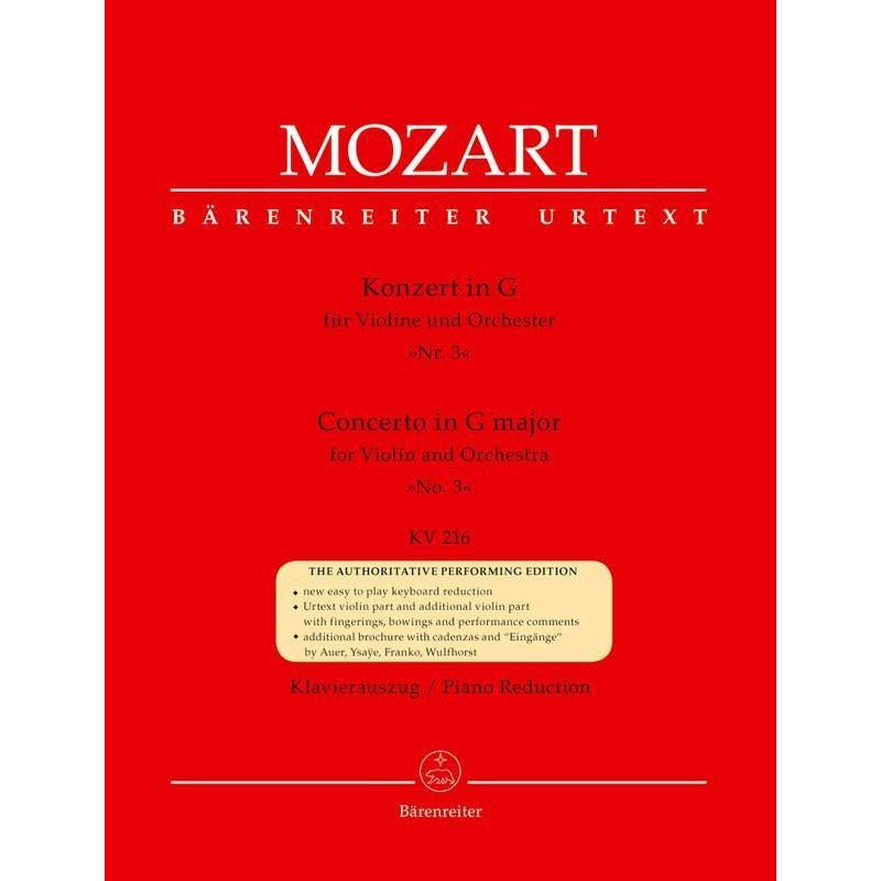 This Authoritative Performing Edition of Mozart's G major violin concerto includes an easier to play piano reduction, uncluttered and practical with page turns where you need them and where necessary fold-out pages. The solo part gives players the critical Urtext of the New Mozart Edition. The tutti passages are all presented in normal size print for players wanting to perform these sections with the first violins. An ossia has been included in small print for the last four measures before the first solo passage to allow for the transition to the solo section. A prepared performance part is also included with bowings, fingerings and performance practice comments. An additional brochure is included with todays most performed cadenzas , " Eingänge " and fermata embellishments by Eugène Ysaÿe , Leopold Auer, Sam Franko and Martin Wulfhorst. This Barenreiter edition offers players a spectrum of styles available in no other publication.